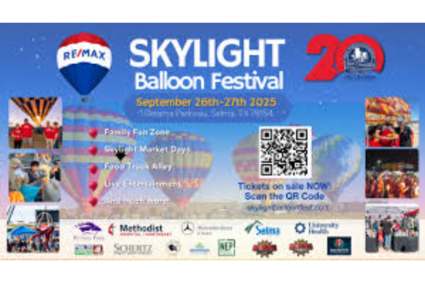 A breathtaking Texas sky painted with vibrant balloons, floating high above the fields.