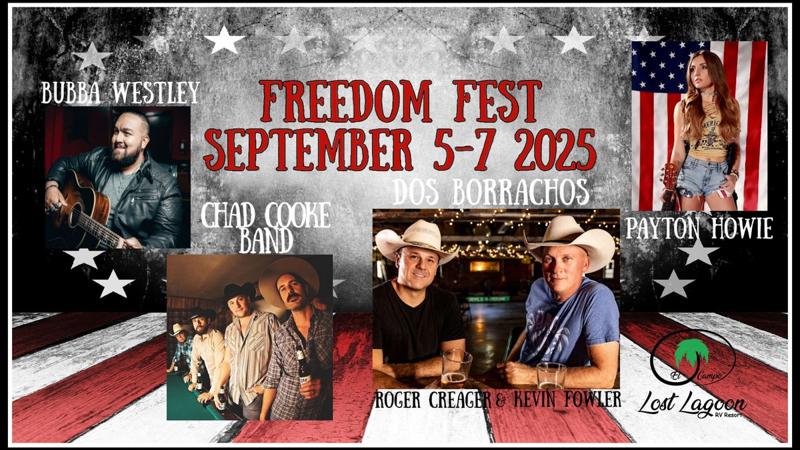 Headliner Dos Borrachos (Kevin Fowler & Roger Creager) 6:30-8:30pm Bubba Westly 12:00-2:00pm Payton Howie 2:30-4:00pm Chad Cooke Band 4:30-6:00pm