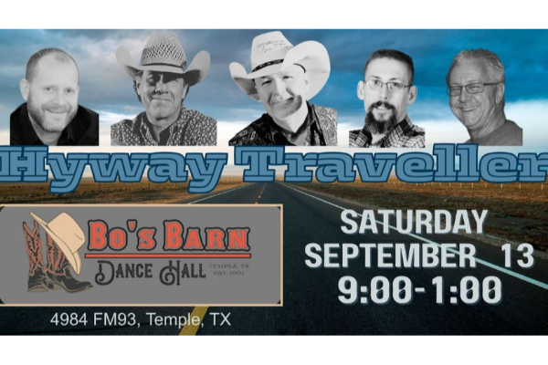 Probably a live music event or themed social gathering by the group Hyway Traveller, hosted at Bo’s Barn (a rustic venue or dance hall). Expect intimate music performance, possibly Texas country or Americana style, with dancing and drinks.