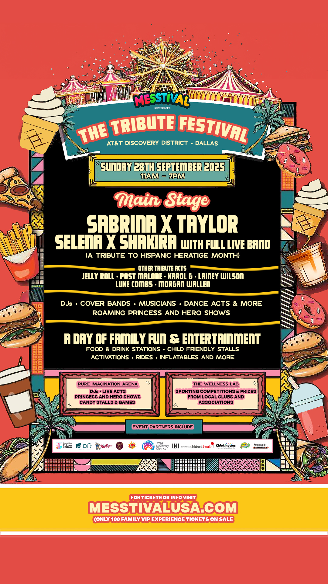 Get Ready, Dallas – Two Wildly Creative Festivals. One Epic Weekend of Music, Magic & Messy Mayhem! MESStival + The Tribute Festival AT&T Discovery District, Downtown Dallas September 27–28, 2025 11:00 AM – 7:00 PM daily This fall, Downtown Dallas transforms into a wonderland of music, color, and chaos (the good kind!) for two back-to-back days of family-friendly fun. SATURDAY: MESStival – Where Fun Gets Wild & Color Runs Free! A hands-on, high-energy day of imagination and play! Perfect for families with kids 0–15 and the young at heart. Expect: Music, games, shows, inflatables, and interactive zones Massive powder paint party at 6PM! Main stage tributes: Sabrina Carpenter, Taylor Swift, Billie Eilish, Hannah x Miley, Jelly Roll, and a full Disney + Wicked Musical Show! Plus roaming characters, family DJs, art stations, Crayola magic, and more. SUNDAY: The Tribute Festival – All the Hits. All the Feels. Celebrate the music of North & South America with jaw-dropping tribute acts, full bands, and cultural pride in honor of Hispanic Heritage Month. Main Stage Tributes Include: Selena, Shakira, Karol G, Post Malone, Morgan Wallen, Luke Combs, Jelly Roll, Sabrina x Taylor Fusion, and more. Bonus: Local youth showcases, surprise performances, and a grand finale you don’t want to miss! 3 more Magical Indoor Arenas to Explore All Weekend: Pure Imagination powered by Crayola Experience Plano – Join the magic of the Crayola Experience surrounded by Live Acts, Roaming Characters, DJs, Activations and Games and of course a world of Pure Imagination and Candy! The Wellness Lab powered by Kidokinetics - A high-energy experience where sports, games, and hands-on fun help your child grow — with awesome mascots, local sports heroes, cool prizes, DJs, wellness zones, and so much more! VIP FAMILY EXPERIENCE – Limited to 150 Families per Day Balcony views + private lounge Festival swag & caricatures Buet, bar, and valet parking Skip the chaos, keep the fun Also Featuring: Over 80 vendors, food trucks & sweets Bounce zones & interactive installations Appearances by mascots from Dallas Trinity FC, Frisco Roughriders, and more! Free parking + secure gated access