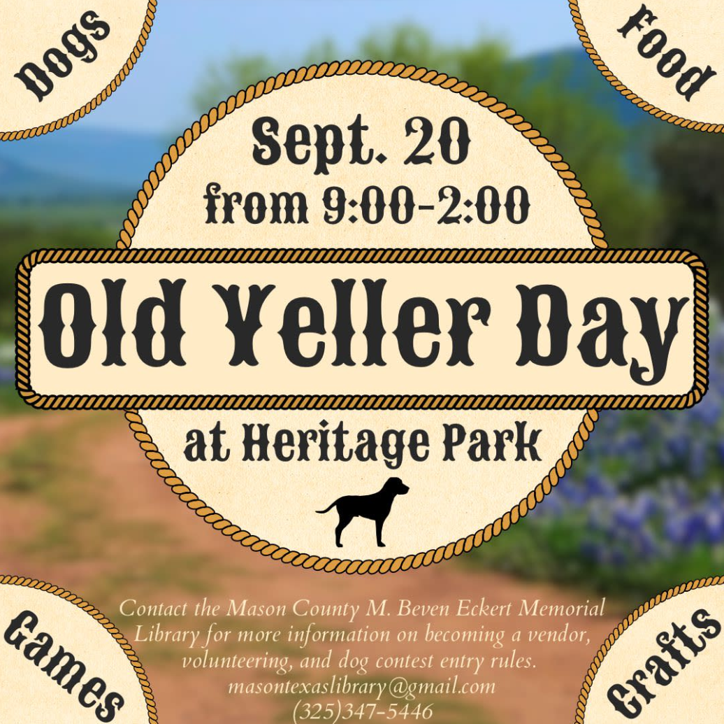 Celebrated at Heritage Park in Mason, Texas on Saturday, September 20, 2025, Old Yeller Day honors author Fred Gipson and his famous canine character with a community festival. Festivities include arts and craft booths, food, live music, children’s games, a dog parade and costume contest, plus a free rabies clinic for up to 100 pets. A living history encampment and screening of Old Yeller round out the day of family fun and frontier heritage